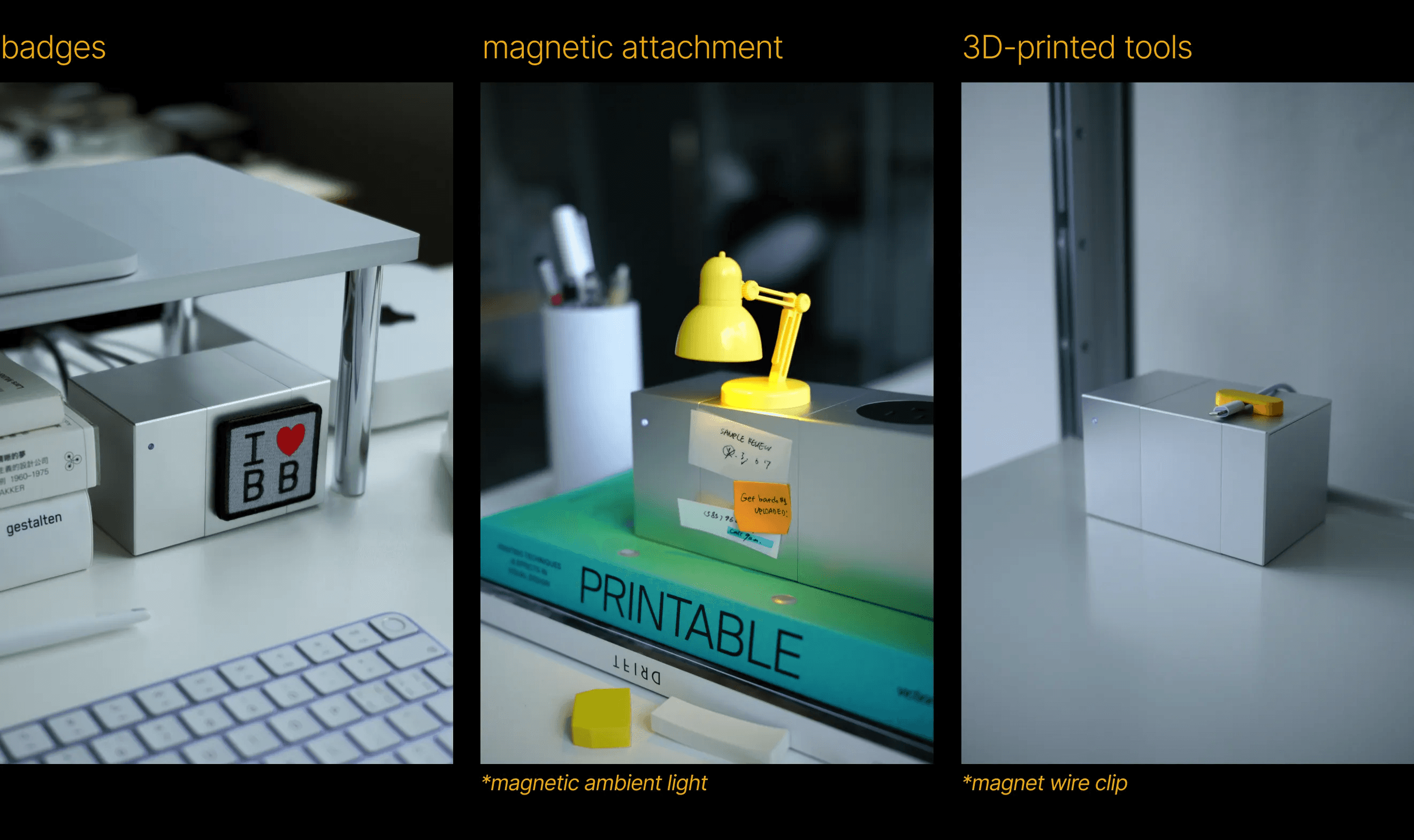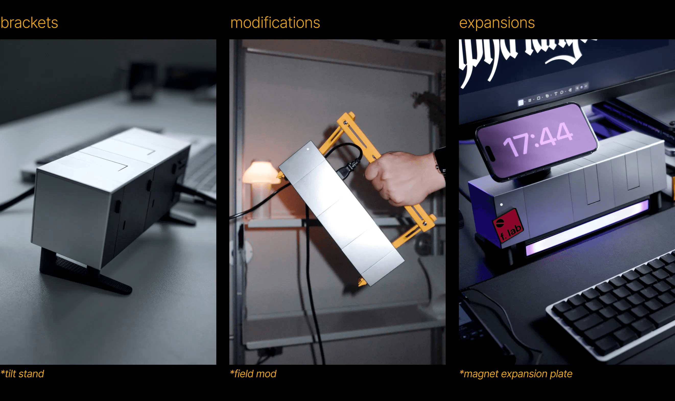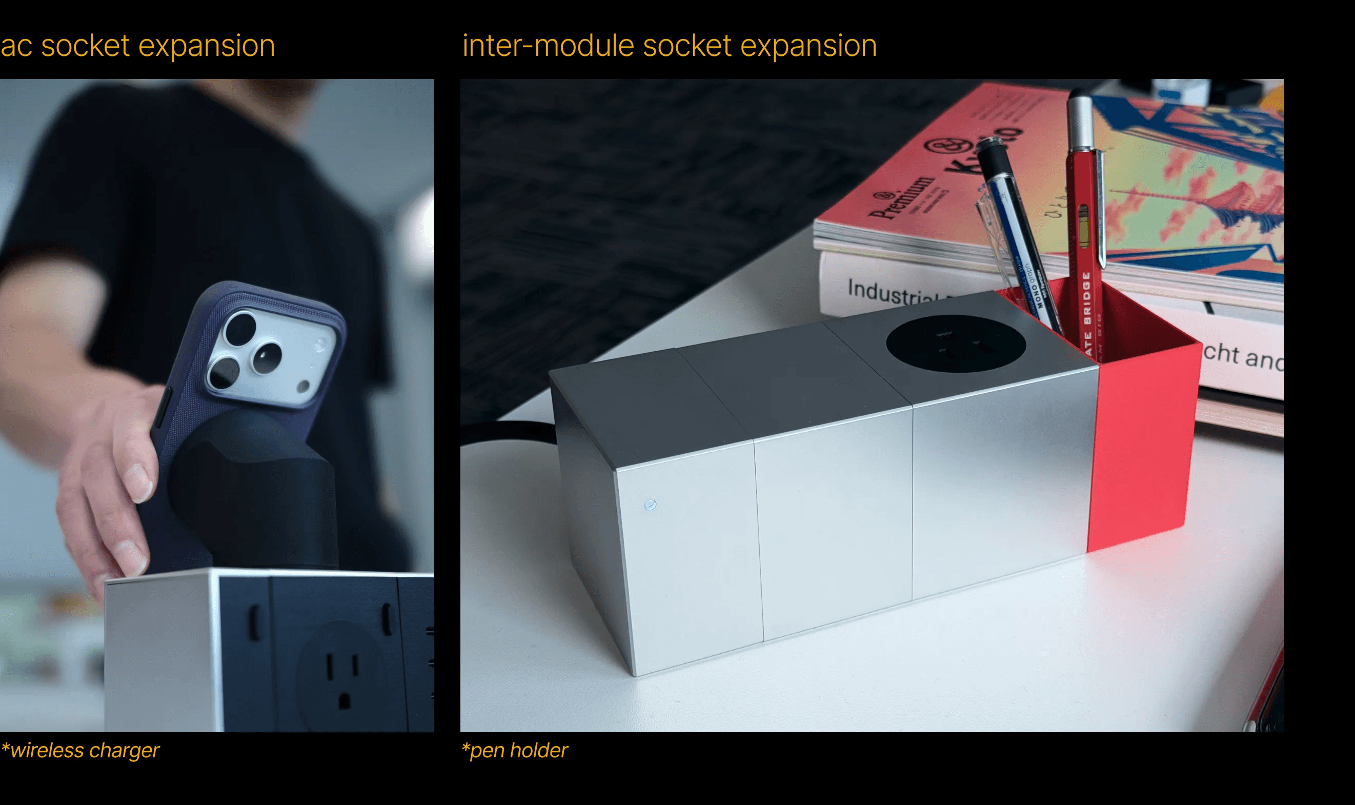 For reference, we created a magnetic wireless charger that works with the AC socket, and a pen holder that replaces the end to add extra storage to your desktop.