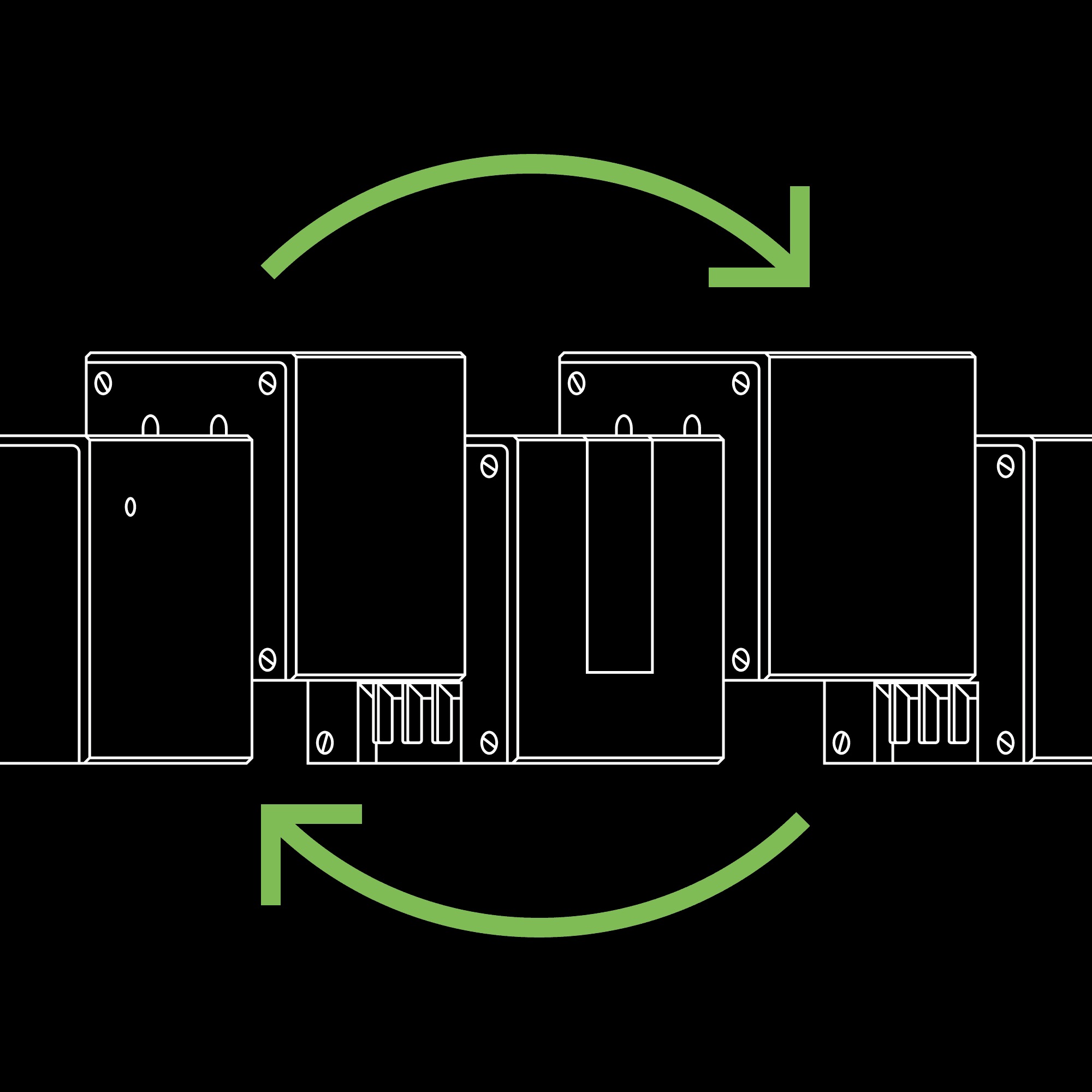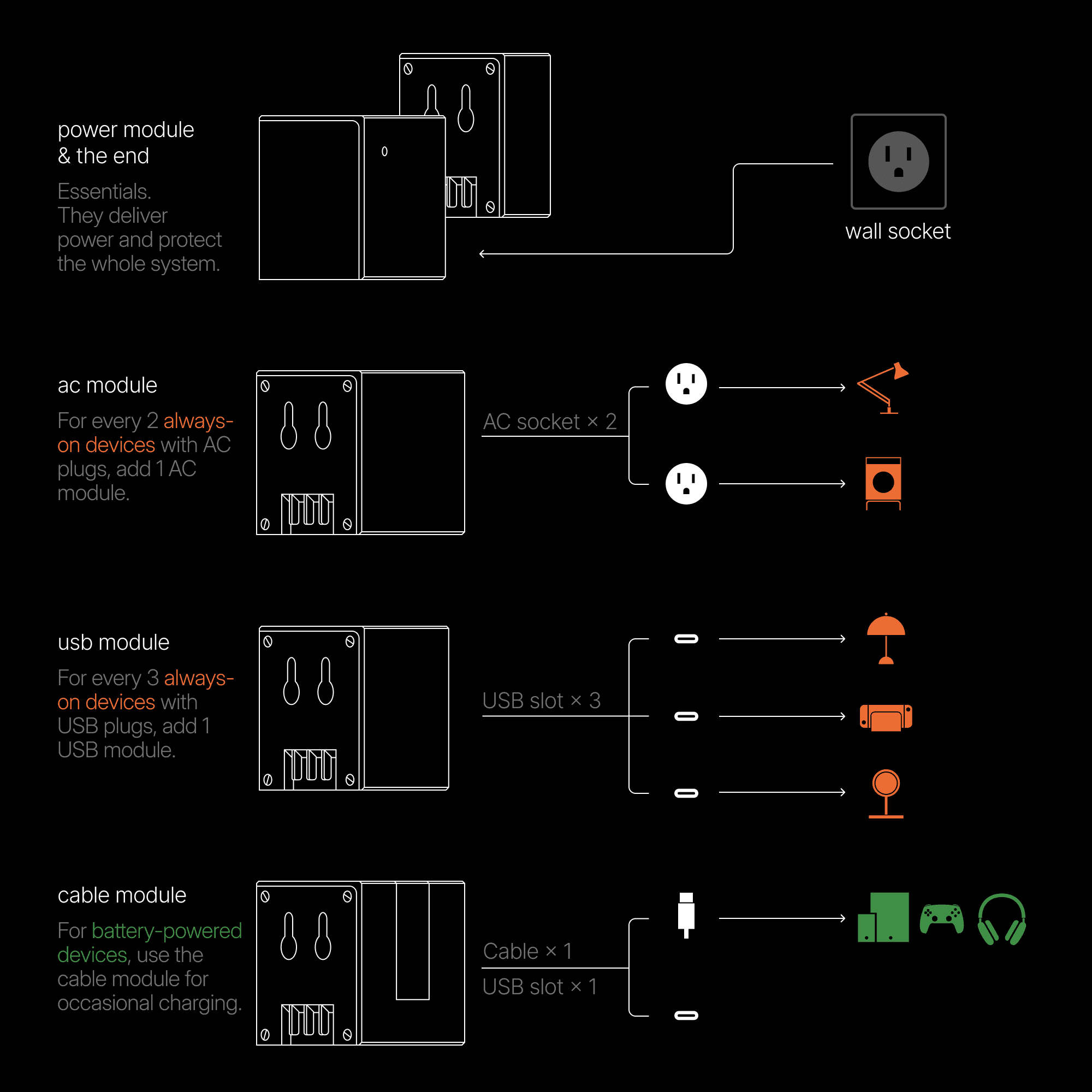 Connect always-on AC devices like printers, stereo speakers, and lamps to the AC module. Each AC module powers up to 2 devices.