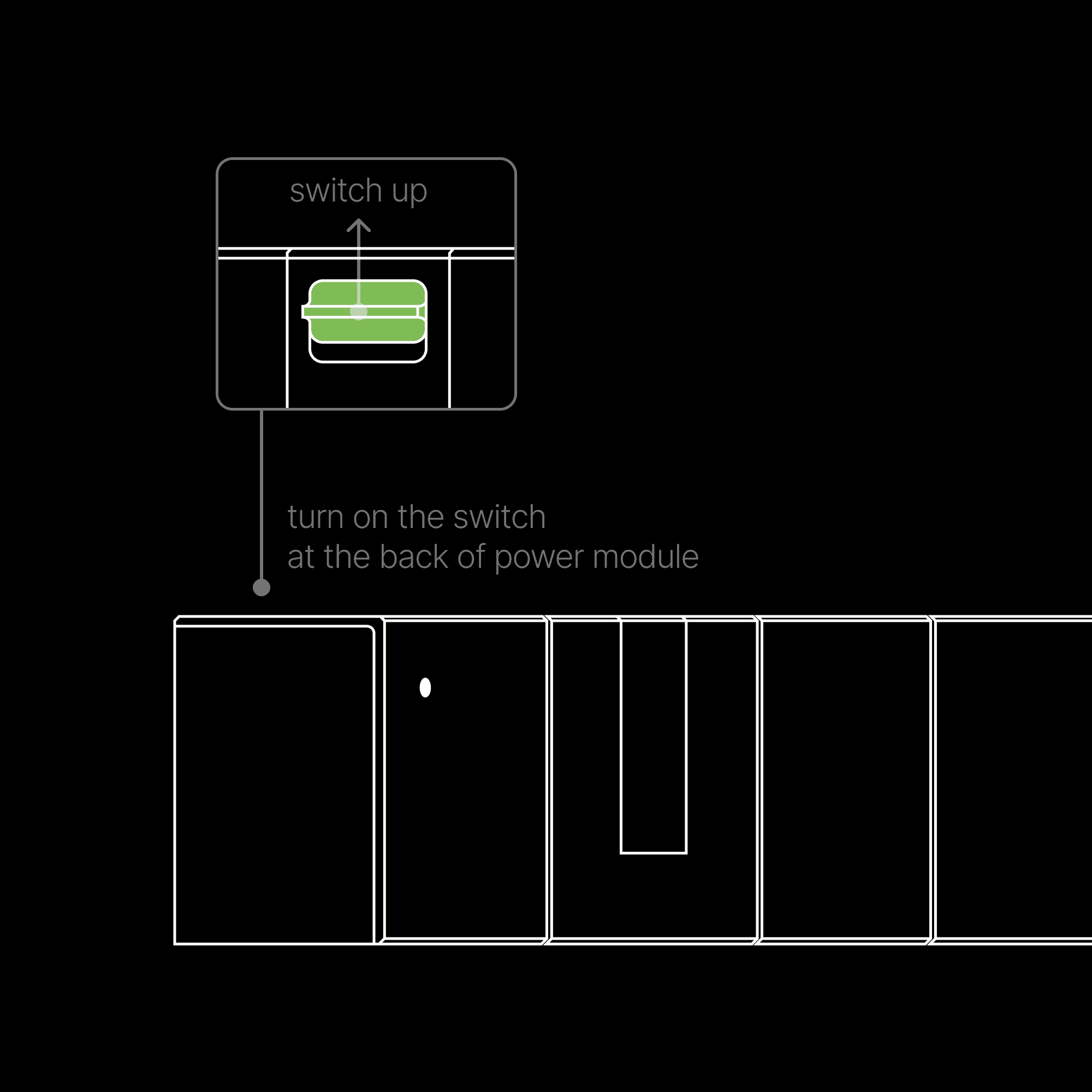 Once again, ensure your assembly is complete and all cables and devices are connected securely. Connect the array and your wall socket with the power cable. Turn the switch on the power module to the up position to power on the system. Check that the power indicator LED is on, and you're good to go.
