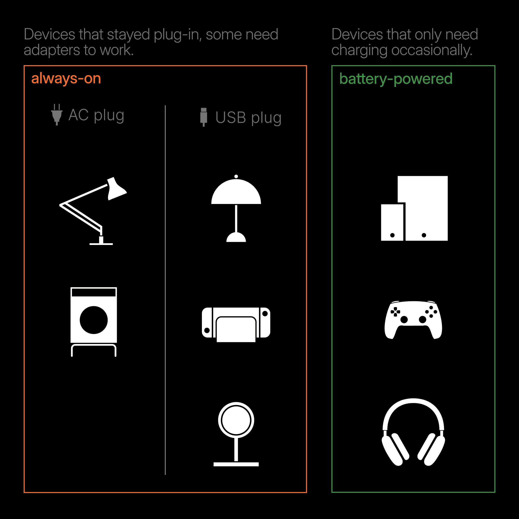 always-on devices: devices that stay plug-in, either with AC plugs or USB cables.
